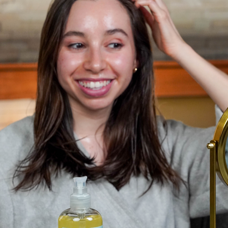 Masajea unas gotas directamente antes de dormir. Lava por la mañana. Ayuda con caspa, resequedad o caída.