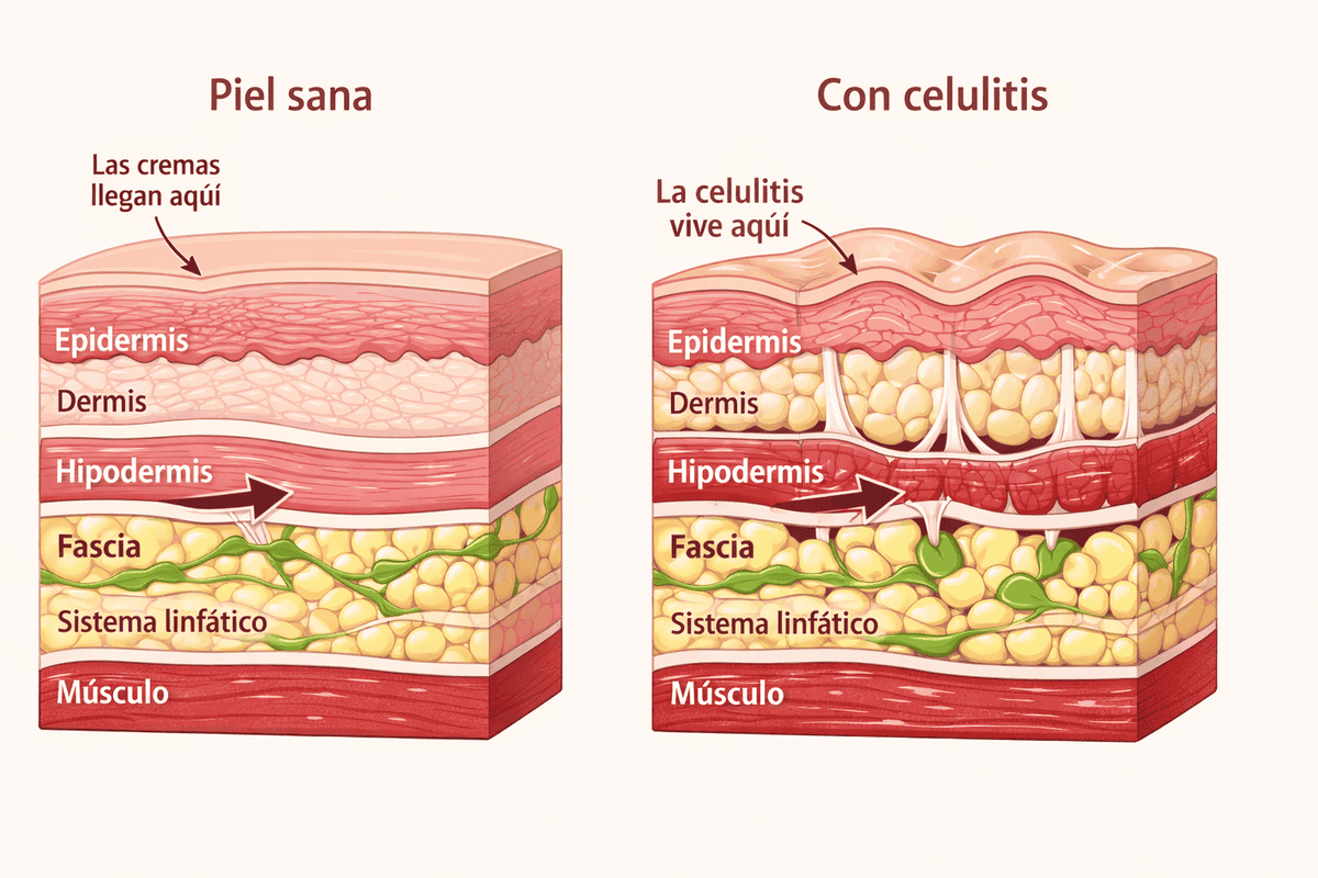 Porque el problema no está en la superficie. La celulitis vive en la fascia — 3 capas más abajo de donde llega cualquier crema. Para llegar ahí necesitas técnica, no solo producto.