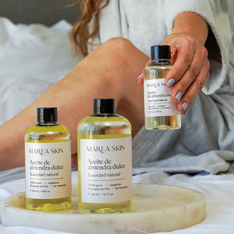 Aceite 100% puro de almendra dulce, prensado en frío, sin hexanos ni conservadores.